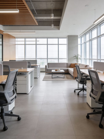 Sleek and minimalist open plan office design featuring ergonomic workstations in rows