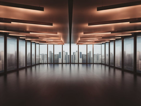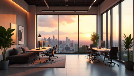 Modern office interior at sunset with city view