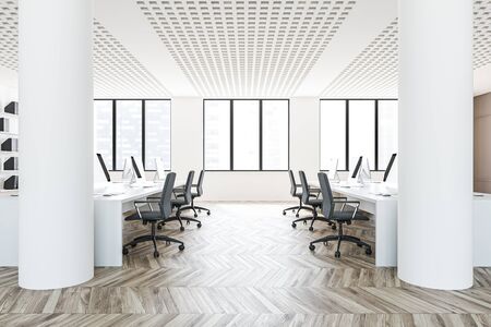 Interior of modern office with white walls, wooden floor and rows of white computer tables. 3d rendering
