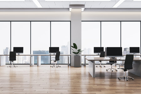 Spacious modern office interior with empty desks and computers, minimalist design style, wooden floor, large windows, city background, 3D Rendering