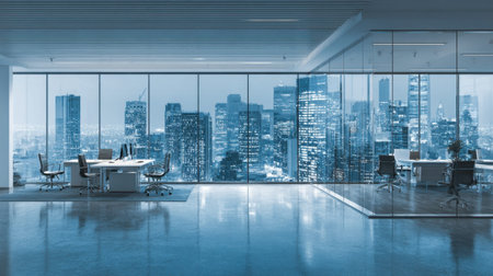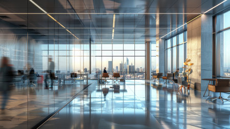 Modern office interior with glass walls, panoramic windows and daylight