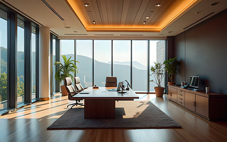 Modern workspace of elegance featuring an executive desk and chairs in a sunny corporate office setting with city view
