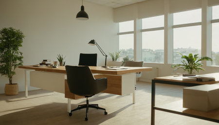 Modern Office Interior with Large Windows and Exposed Ceiling Beams