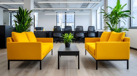 A bright office features two vibrant yellow sofas facing a black table with a potted plant in between. Large windows and greenery create a calming atmosphere, enhancing comfort.