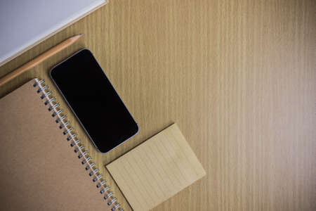 mockup phone with notebook and paper on a wooden table.