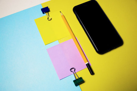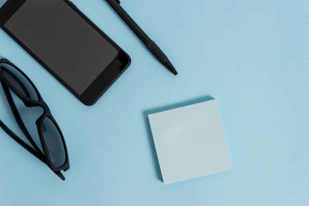Eyeglasses colored sticky note smartphone cell pen cool pastel background