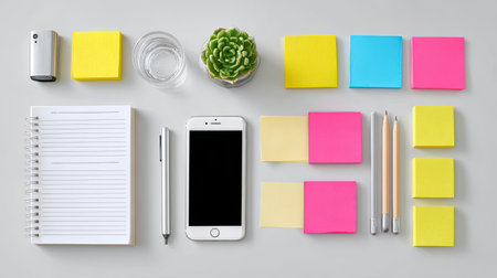 A clean and modern flat lay of a workspace featuring a smartphone, notepad, stationery items, a succulent plant, and colorful sticky notes, perfect for inspiration.