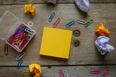 Top view of trash paper,paper clips and yellow sticky notes on wooden background. Copy Space.