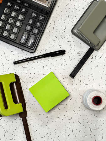 Flat lay with stationery items on a white background. The concept of office work.