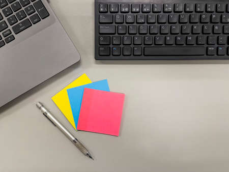 top view of a gray desk in an office with a black computer keyboard, a laptop keyboard, a mechanical pencil and three packets of yellow, blue and pink
