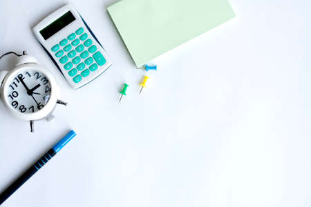 Home office clock calculator note paper and pen on white background copy space
