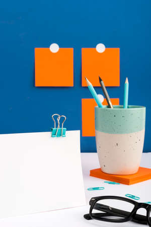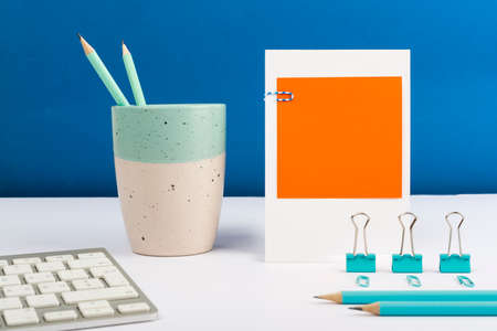 A large, blank blue card on the desk and a small pink card with space for text. Office accessories, alarm clock, computer keyboard, pens, crumpled paper balls, staples. Concept