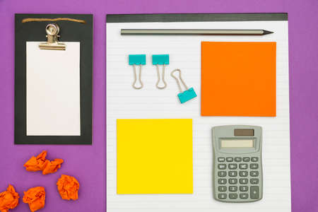 Overhead shot of a desk with various office tools, and calculator. creative photo.