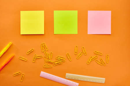 Colored sticky notes on a light background. The view from the top. Space for text. Horizontal photos