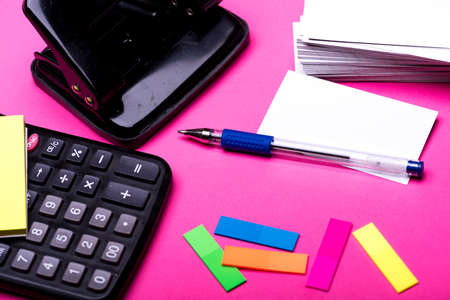 Stationery and calculator. Office supplies and business idea concept. Business cards in holder, binders, clips and elastics near sticky notes. Notebook and puncher near pen on white wooden background.