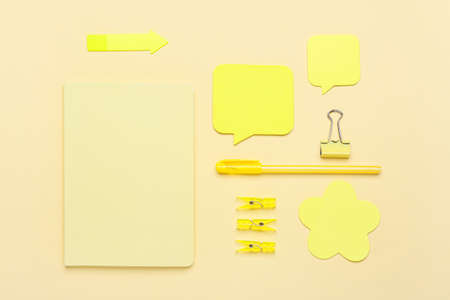 Set of stationery with sticky note papers on color background