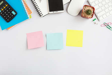 Top view office desk with smartphone, computer and office supplies with sticky note