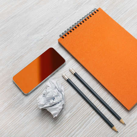 Photo of blank stationery set on light wood table background. Blank orange notebook, smartphone, pencils and crumpled paper.
