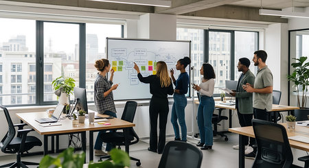 Business team collaborates in a modern office space during a brainstorming session with sticky notes and digital devices