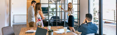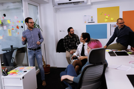 Diverse group of creative colleagues discussing work and brainstorming at meeting. modern office of a creative design business.