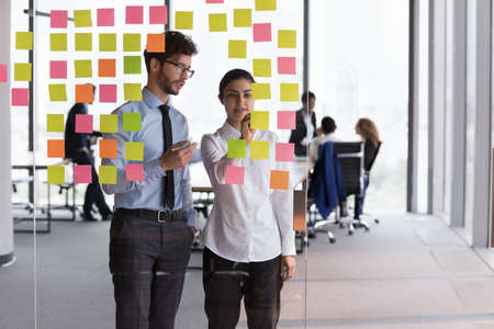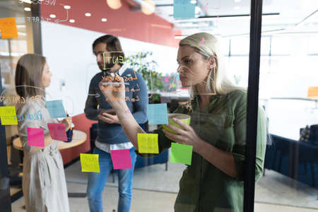 Young multiracial team collaborates through glass wall with sticky notes and markers