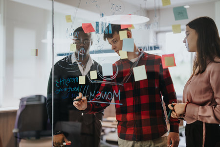 Professionals brainstorming with sticky notes on glass wall in a bright office setting
