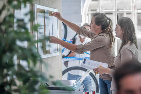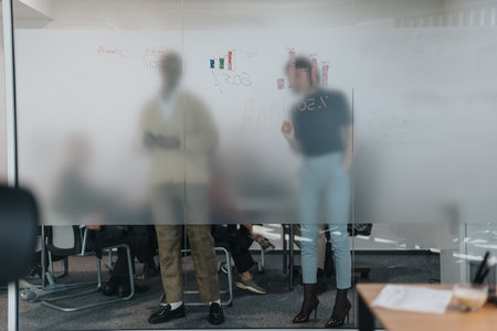 Diverse group of business people working in creative office. group of people brainstorming and taking notes on glass board. business people and work colleagues at a busy creative office.