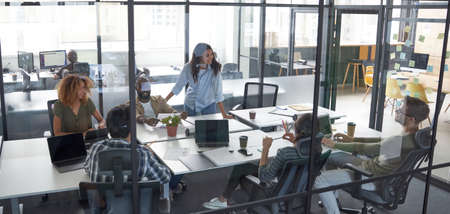 Successful project team working together and communicating in the modern office. Group of multiracial business people having a meeting in board or conference room