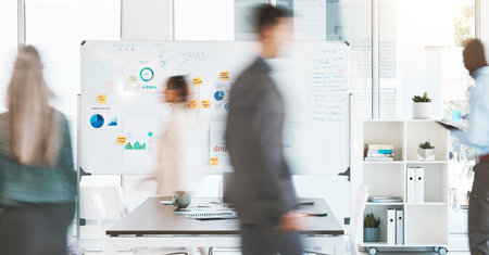 Office workers are seen as blurs of motion, actively working and moving in a modern open plan corporate office, conveying a sense of teamwork and productivity