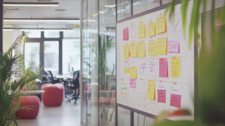 A vibrant arrangement of sticky notes on a whiteboard captures the essence of brainstorming and project planning in a dynamic workspace environment.