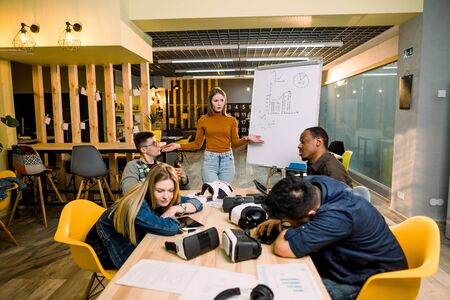 Angry businesswoman in casual outfit looking at tired colleagues sleeping during presentation in modern office. Meeting of businessteam, VR glasses project