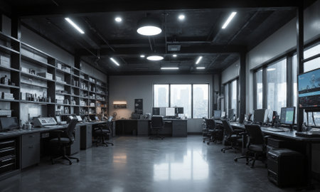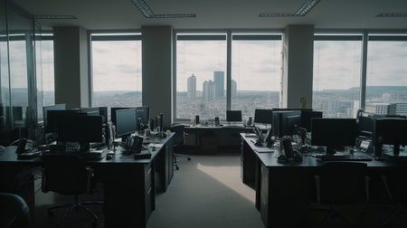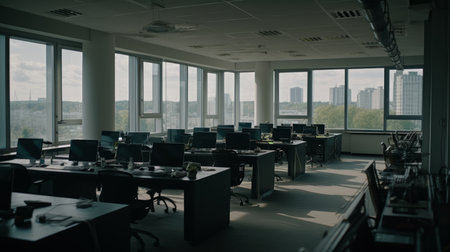 Rows of computers line an empty office space, highlighting the stark, modern workspace. Focus on technology and business environment.