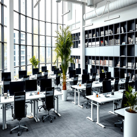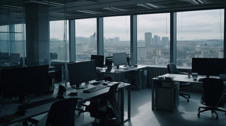 Embracing Productivity and Serenity: The Ideal Work Environment of Open Office Spaces with Desks, Computers, and Expansive Windows