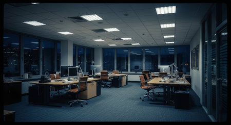 A modern office space at night with empty desks and chairs, large windows showing city lights, minimalistic design