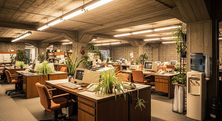 A spacious office interior featuring multiple desks with computers, plants, and water cooler, showcasing a retro design with concrete walls and warm lighting