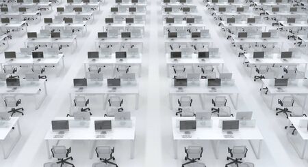 Many empty identical workplaces with computers in the interior of an office open space. Large bright office room in black and white without people. 3D rendering.