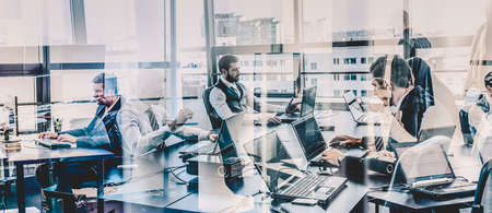 Business people working on laptop computer in modern office with panoramic windows and city view