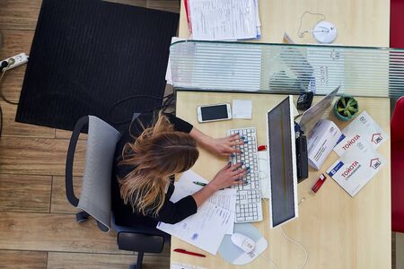 Top view on modern open space office with comfortable workplaces. Overhead view. By generative Ai