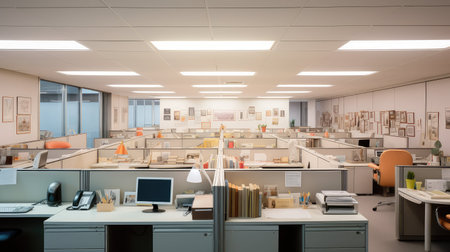 An empty office space with cubicles, old computers, and a few plants, showcasing a quiet and organized work environment