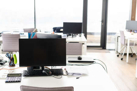 Modern bright open space office interior with computers and equipment. Nobody inside