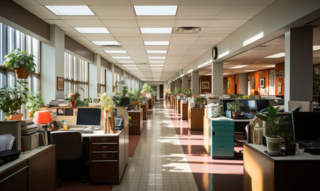 Spacious, well-lit, empty office with comfy interiors. AI Generative