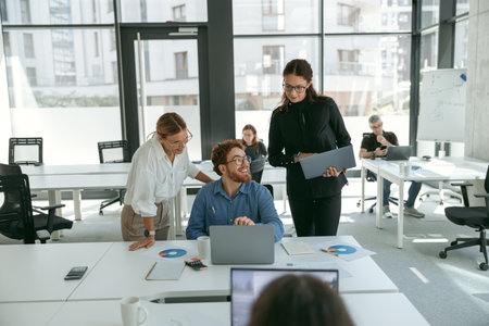 Group of young adult coworkers collaborating at shared desk with laptops and documents in modern creative coworking space
