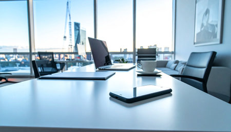 A contemporary conference room featuring a long table with a laptop, coffee cup, and notepad. Large windows allow natural light to fill the space.