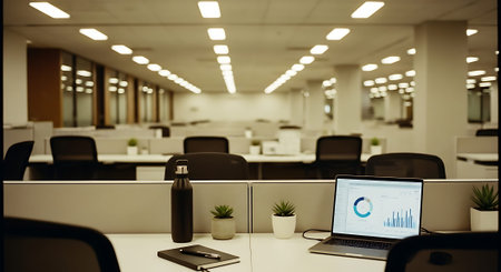 A well-lit office space with cubicles, a laptop displaying charts, and small potted plants on desks.