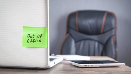 Out of office, message on yellow sticky note. Work from home concept