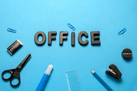 top view flat lay office supplies and inscription office