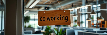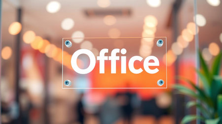 A wooden sign reading 'OFFICE' hangs on a brick wall, with a blurred office space in the background featuring plants and furniture.