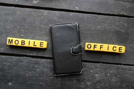 Text of business office on wooden cubes in front of office desk. There are laptop and office supplies on the table. Consept and studio.