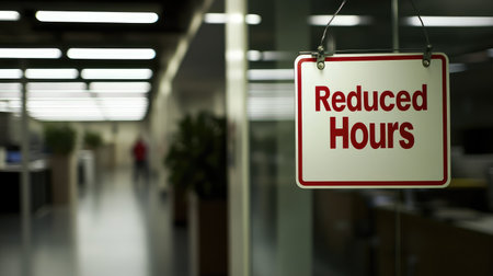 A Reduced Hours sign posted in a workplace, symbolizing economic instability and employment issues.