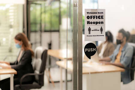 Signage of Office Reopen with social distancing practice with blurred background of Asian team business people working and wear face mask in new normal office to prevent covid-19 virus spreading.